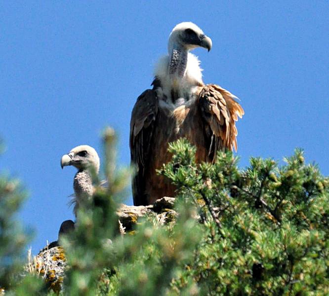 Puis, providentiellement tombés du ciel, timidement d’abord et, de plus en plus nombreux, des équarrisseurs ailés et zélés, sont venus des Grands Causses voisins, ces grands vautours, si élégants et majestueux dans les airs, si gauches et patauds au sol. Certains jours, on peut observer leur incessant ballet aérien, au-dessus de la zone artisanale et quelques témoins privilégiés en ont compté plusieurs dizaines, rassemblés au sol ! Les plus nombreux sont les vautours fauves mais des vautours moines ont également été repérés. Leur présence atténue quelque peu le pitoyable spectacle des malheureux rongeurs errant en plein jour, aveugles et agonisants. Il est à noter, qu’on n’a pas observé d’attaques sur des animaux malades encore vivants et donc particulièrement vulnérables. Laissons donc ces grands oiseaux, poursuivre tranquillement leur œuvre de salubrité publique et rappelons, au lendemain de l’ouverture de la chasse, (mais est-il besoin de le préciser ?), que les vautours sont rigoureusement protégés, comme tous les rapaces d’ailleurs.