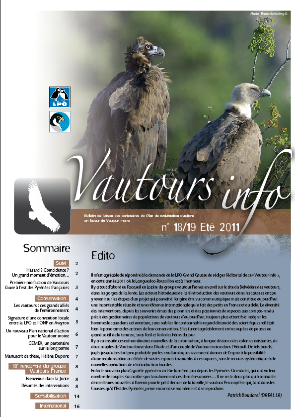 Le numéro 18-19 (été 2011) de « Vautours info », le bulletin de liaison des partenaires du plan d’action en faveur du vautour moine est sorti, à télécharger ou à consulter en ligne.