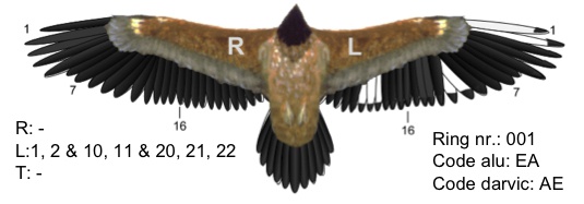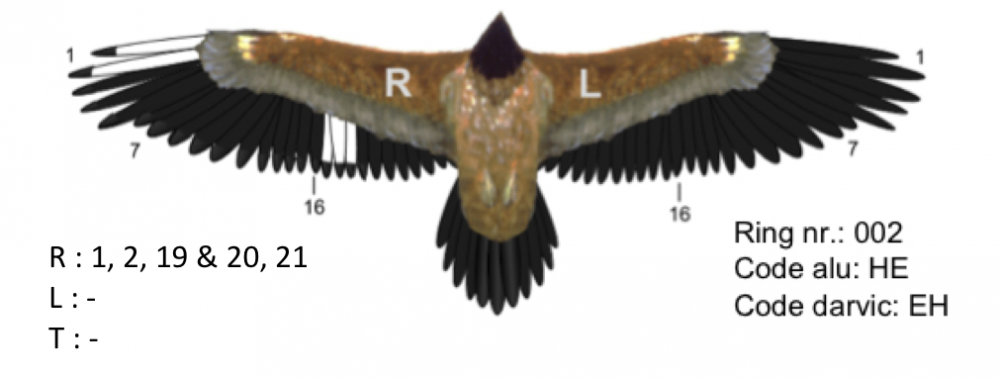 Aile droite : rémiges 1,2 & 17, 18, 19.