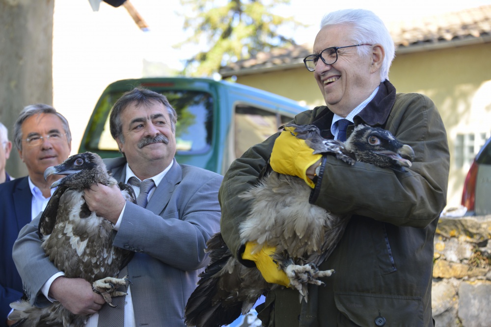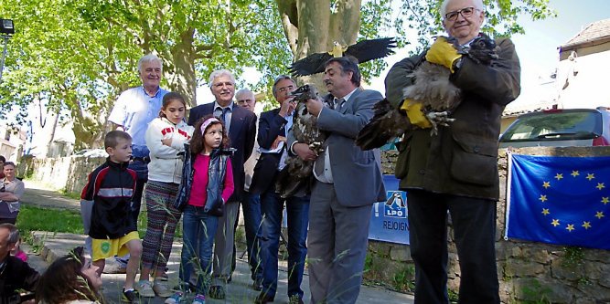 Les oiseaux ont été présentés à la population locale, aux élus et aux enfants de l’école de La Cavalerie, réunis pour accueillir ces deux nouveaux arrivants, sur la place du Claux dans le village de Nant.