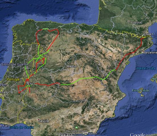 Depuis le 25 mai, le Vautour moine « Abricot » est toujours en Espagne (avec quelques passages au Portugal).