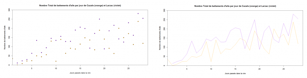 Cazals, moins active que son congénère au début, a bien rattrapé son retard. Elle a effectué ensuite des séries de battements de plus en plus longues (jusqu’à 31 battements d’affilée).