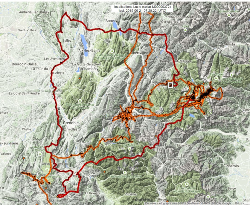Après le 8 juin, elle est retournée en Haute-Maurienne et en Haute-Tarentaise, puis elle a effectué une grande boucle le 19 et 20 juin (tracé rouge sur la carte) de 557 km.