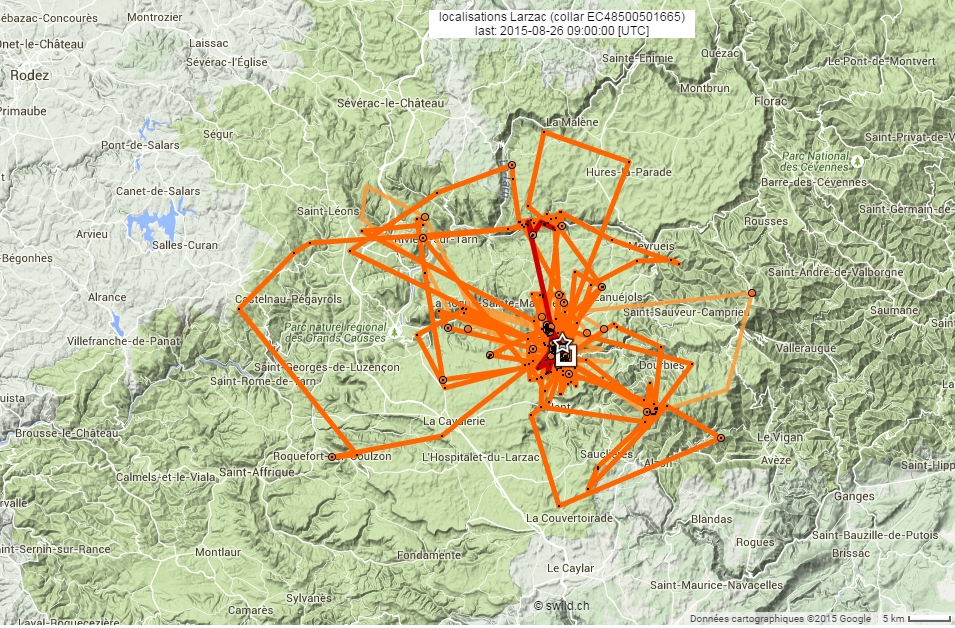Layrou semble se sédentariser dans les Grands Causses. Aucun déplacement en dehors de cette zone géographique n’est constaté depuis un an et demi. Il arpente essentiellement les corniches des gorges de la Jonte.