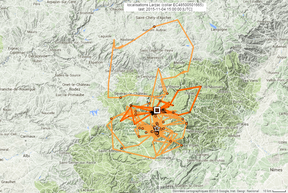Bien qu’ils se soient cantonnés essentiellement au même secteur depuis septembre, Larzac et Cazals ont effectué quelques échappées vers d’autres zones :Cazals a réalisé, dès début août, de courts déplacements hors du site de lâcher (des déplacements jusqu’à Verrières, Sauclières, dans les gorges du Tarn, dans le Nord de l’Hérault, etc.). Le 26 août, elle a élargi son secteur de prospection avec un aller-retour dans le Massif central (proche du Puy-en-velay, d’Aubenas ou encore de Langogne). Egalement, les 10 et 11 octobre, on a relevé un déplacement plus important, dans le Minervois (une donnée satellite proche de Montolieu). Larzac a suivi sensiblement la même évolution que sa congénère mais il a nettement moins poussé ses explorations. Les secteurs les plus éloignés qu’il ait visités se situent dans le Sud-Ouest de l’Aveyron (Roquefourt-sur-Soulzon), l’Aubrac (Aumont-Aubrac), le secteur de Mende ainsi que Les Cévennes (Pont-de-Montvert).