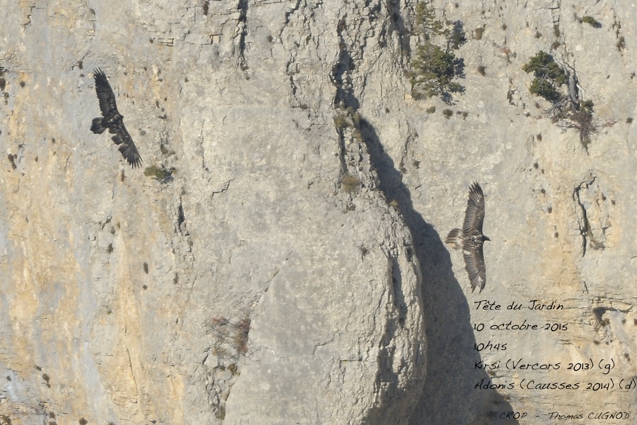 Les deux gypaètes lâchés en 2015 ont à présent quitté le site de lâcher des gorges du Trévezel. A partir de mi-septembre, quasiment trois mois après leur envol, Larzac et Cazals se sont établis dans les gorges de la Jonte. Ils ont rapidement été rejoints par Layrou (qui n’a pas quitté les Grands Causses depuis son relâcher). Les trois individus ont d’ailleurs été observés à plusieurs reprises ensemble, en aval des gorges.