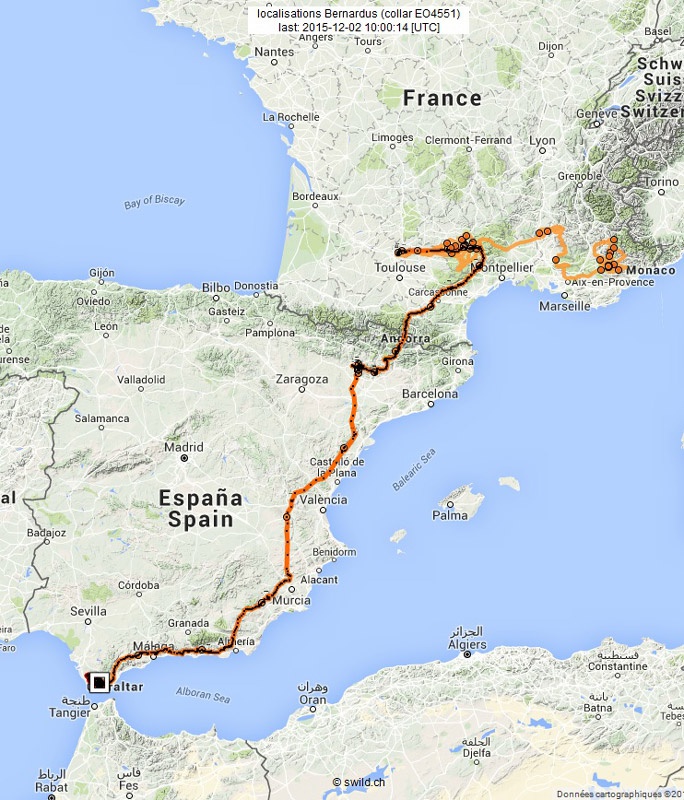 Le 22 novembre, elle entame une descente vers le sud de l’Espagne, traversant successivement la communauté de Valence, celle de Murcie pour enfin frôler Gibraltar (Andalousie) le 27 novembre. Durant ses 6 jours de descente, elle a parcouru sans relâche 1134 km (141 le 22/11, 210 le 23/11, 242 le 24/11 son record, 215 le 25/11, 148 le 26/11 et enfin 176 le 27/11). Nous nous attendions depuis quelques jours, aux vues de son parcours, à la voir rejoindre le Maroc par le célèbre site de migration du rocher britannique, à l’instar des jeunes Vautours fauves qui vont jusqu’au Sénégal (un Vautour fauve juvénile né dans le Verdon a été identifié à Fadial, au Sénégal en janvier 2010 pour revenir nicher. Mais il n’en est rien pour l’instant, la Méditerranée l’aura peut être découragée.