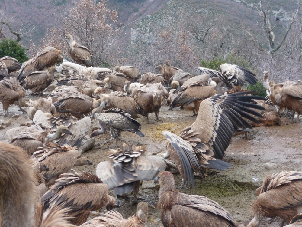 Ainsi, lors de la curée sur le site de Cassagnes, les vautours fauves étaient comme d’habitude les premiers, suivis par des vautours moines. Ensuite, le Gypaète Barbu, Layrou, est venu se poser près des volières. Il est resté posé, à observer la scène avant de repartir, alors qu’un Percnoptère profitait des restes laissés par les vautours fauves.