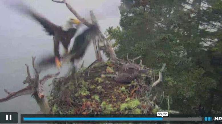Aux Etats-Unis, une aire de Balbuzard est suivie par caméra à Hog Island (Maine) par la National Audubon Society. Le 1 août, un couple de Pygargue à tête blanche capture sur l’aire un jeune Balbuzard parmi les 3 prêts à l’envol : http://www.audubon.org/