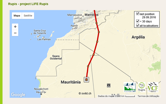Rupis le jeune Vautour percnoptère qui a été bagué et équipé d’un GPS en juillet dernier dans le Douro en Espagne a entamé sa migration le 20 septembre. Après avoir fait 700 km en deux jours, il a traversé le détroit de Gibraltar le 22, s’est dirigé vers Meknes, et est entré dans le désert vers Ouarzazate le 24. Le 29 Septembre il est passé en Mauritanie après avoir survolé l’Algérie.