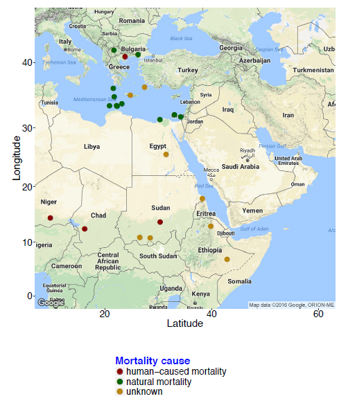 The study shows that poor navigation during the overflight of the Mediterranean represents the greatest cause of mortality of young people (43%). Six birds died of unknown causes but at least three were hunted.