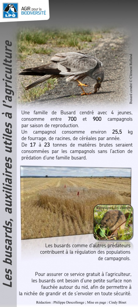 La LPO Rhône a réalisé récemment une plaquette de sensibilisation des agriculteurs à la protection des busards, intitulée « Les busards, Auxiliaires utiles à l’agriculture ». Elle peut être utilisée sur le terrain pour obtenir l’aval des agriculteurs et propriétaires au moment de la protection des nichées.