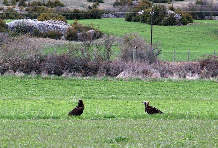 Voici une photo de vautours moines posés au sol sur le Causse Méjean en Lozère, le plus foncé est un jeune individu, celui de droite est un adulte…
