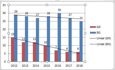 The first results from the monitoring of the species in Bulgaria and Greece show similar tendency in the number of occupied territories and the number of pairs compared to 2017. The number of occupied territories is 25 for Bulgaria (19 in the Rhodopes and 6 in northern Bulgaria) and 6 in Greece (3 in Dadia Forest reserve, 1 in Kompsatos area and 2 in Central Greece) (Figure 1). The number of pairs in Greece hasn‘t changed in the last 5 years (5 pairs) while it has slightly decreased in Bulgaria (down to 25 in 2018)(Figure 2). However, the status of some breeding territories of the speies is still not confirmed and we expect good breeding season and increase in the number of occupied territories and the number of pairs in the next phase of the monitoring.