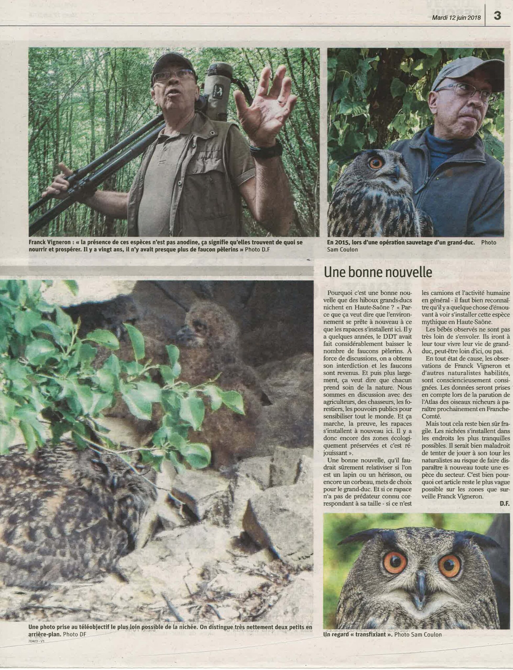 En Haute-Saône, le Grand-Duc est réapparu comme nicheur en 2012. Trois couples sont connus dont deux se reproduisent dans des carrières du centre du département.Sur ces deux sites de nidification, des mesures de protection sont mises en œuvre pour préserver la quiétude des oiseaux. L’Est Républicain, dans son édition du 12 juin 2018, consacre un article à l’espèce et à son retour bien suivi par un observateur, Franck Vigneron.