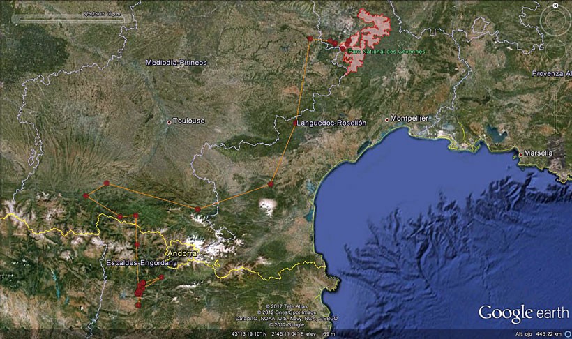 Muga, une femelle originaire de Catalogne (programme de Boumort, Lérida) a elle aussi emprunté ce couloir. Le suivi satellite de cet oiseau permis de connaître ses déplacements jusqu’à son arrivée dans les Cévennes, le vendredi 25 mai 2012. Vous pouvez visualiser ses déplacements sur la carte ci-jointe.