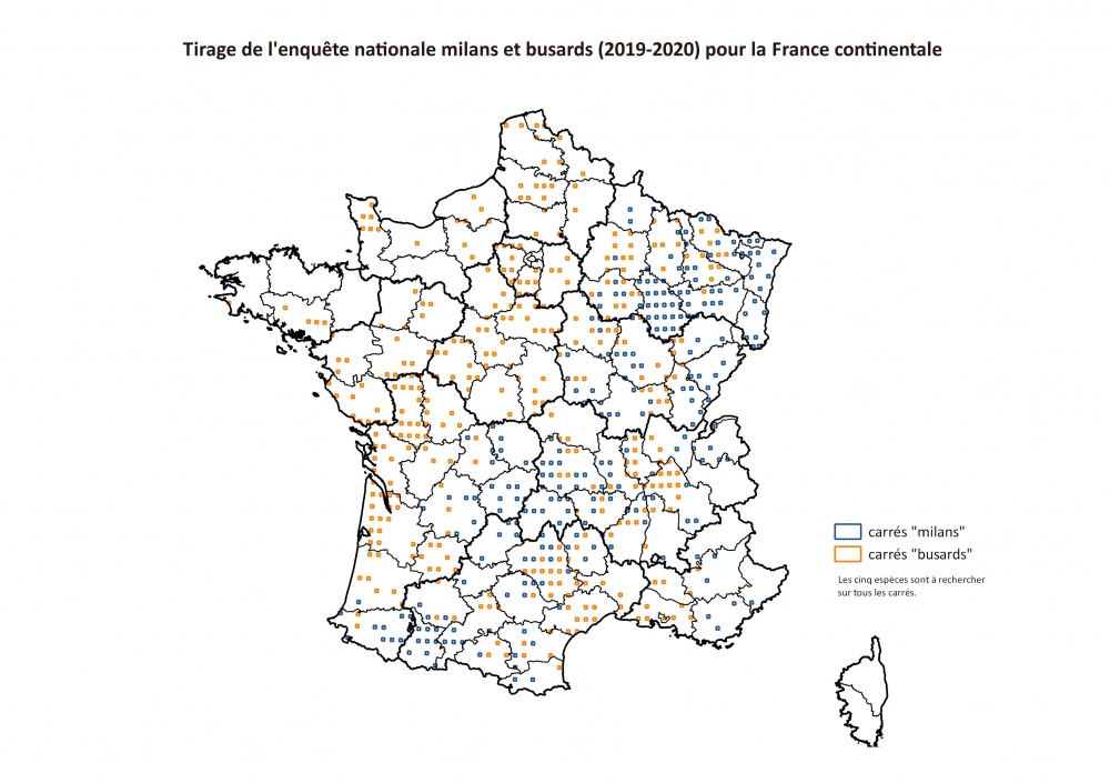 En ce qui concerne le Milan royal et afin de compléter l’échantillonnage, les carrés sélectionnés sont ceux réalisés lors des enquêtes précédentes auxquels s’ajoute un certain nombre de carrés tirés au sort sur les marges et le coeur de l’aire de répartition. Un tirage spécifique est réalisé pour la Corse afin de tenir compte des spécificités de répartition du Milan royal sur l’île. Un tirage complémentaire de 20 carrés a également été ajouté pour le Milan noir. Cette action s’inscrit dans le cadre du Plan national d’actions en faveur du Milan royal (2018-2027).