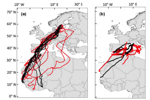 Différents trajets de migration des balbuzards (a) « LDM » venant de Suède et (b) « SDM » venant de Méditerranée. Les adultes en noir et les juvéniles en rouge.