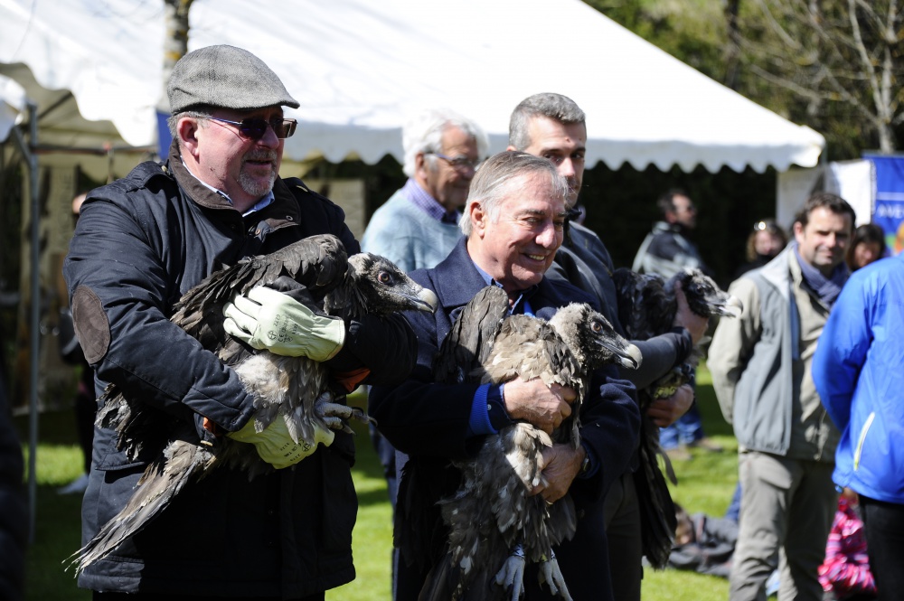 Après les prises de paroles de Mme Giraud (Responsable de site LPO France), M. Jeanjean (1er adjoint au maire de la commune de Meyrueis), M. Néouze (président du conseil consultatif de la Vulture Conservation Foundation), M. Bougrain-Dubourg (Président de la LPO France), M. Couderc (Président du Parc national des Cévennes), et M. Boudarel (Coordinateur de PNA, DREAL Occitanie), les 3 oiseaux ont été présentés au public. Ils ont pour parrains M. Chabbi, substitut du procureur du Parquet de Rodez (absent excusé), M. Bougrain-Dubourg et M. Couderc.