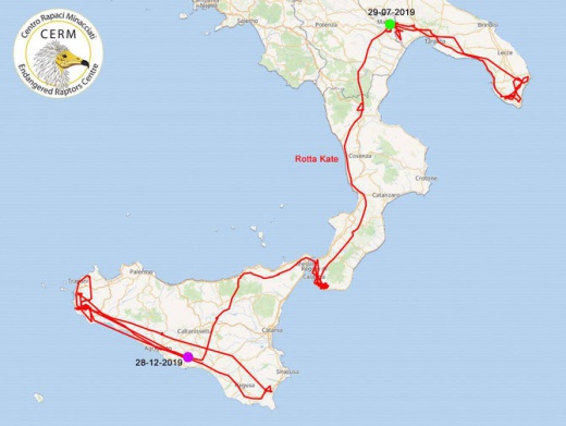After leaving the release zone on September 30th 2019, Kate flew towards the South and reached the western coast of Sicily on October 18th. Since then, she had been exploring the area to find food. She was Ceccolini’s great coordination who gave Kate’s location in real time to volunteers. Closely monitored by volunteers who protected her and brought her food as early as possible. The monitoring was made possible thanks to a satellite transmitter and CERM director Guido Ceccolini