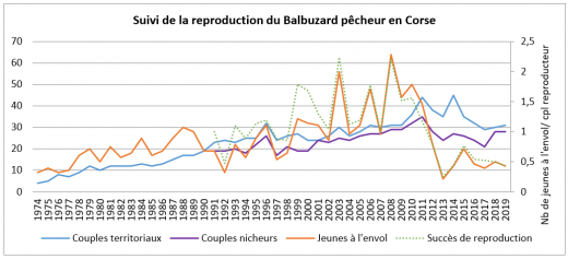En Corse, on assiste à une chute du succès reproducteur (de 2,2 en 2008 à 0,4 en 2019) alors que le nombre de couples reproducteurs reste relativement stable. En 2019, 12 jeunes à l’envol ont été dénombrés, dont 2 dans la réserve naturelle de Scandola alors qu’on en comptait 15-20 à l’envol jusqu’en 2010. Il est indispensable que la surfréquentation touristique dans la zone de protection marine, impliquée dans le déclin du Balbuzard en Corse, soit surveillée et régulée pour protéger les couples du dérangement et permettre à la population de se renouveler.