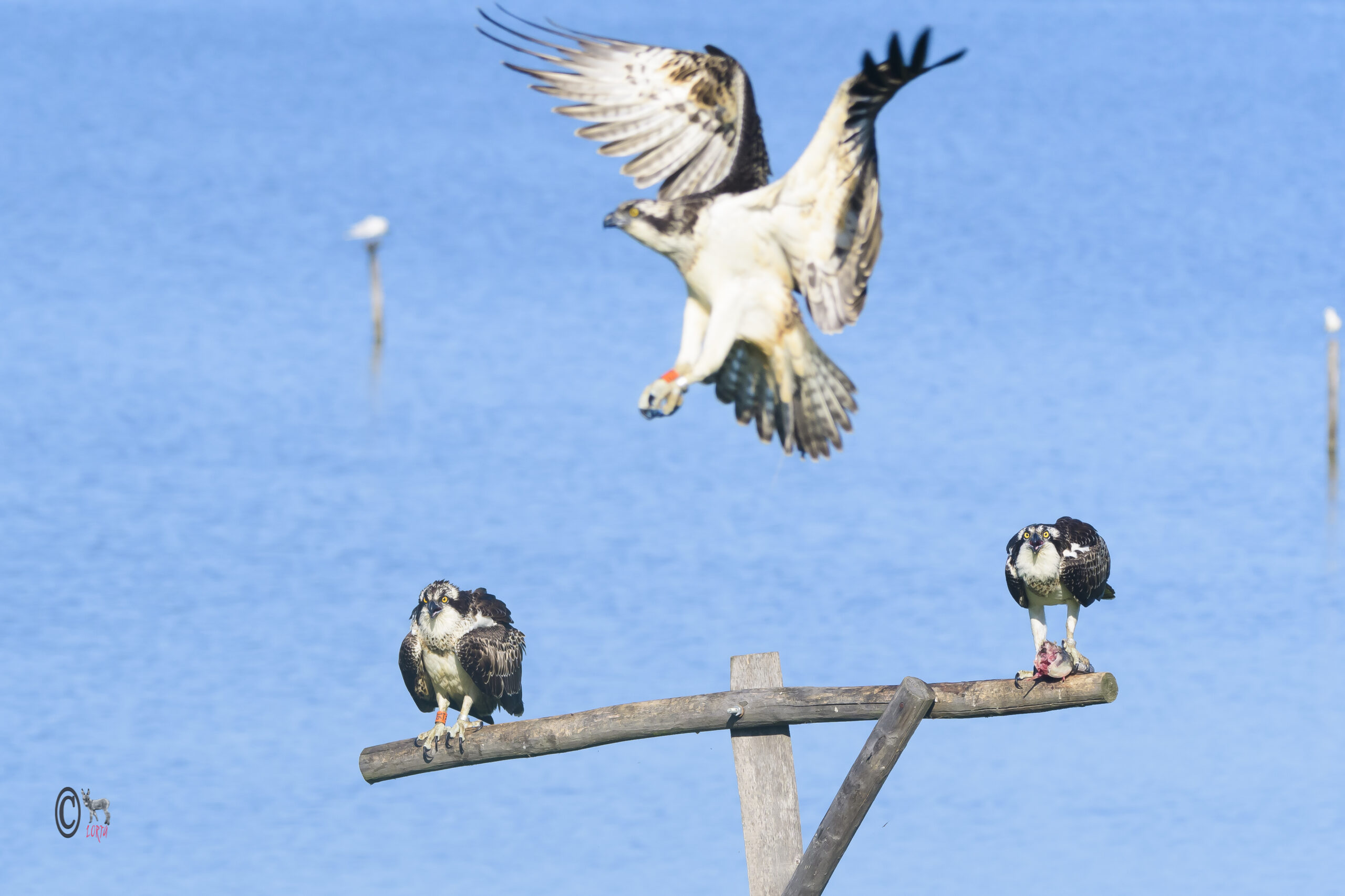 Pour cette saison 2020, l’activité des balbuzards sur la zone de translocation a été intense comme en témoigne le retour du mâle basque/espagnol issu du programme de translocation de la Réserve de biosphère d’Urdaibai lâché en 2017. Observé pour la première fois fin juillet 2019 auprès des jeunes relâchés sur le site du Marais d’Orx, son arrivée le 10 avril 2020 et sa présence jusqu’au 28 septembre 2020, n’est pas passée inaperçue durant toute cette période. Très démonstratif, territorial et bien cantonné sur la zone de lâcher, il a attiré pas moins de cinq femelles différentes qui se sont succédées au fil des mois. Grâce au port de bagues, les origines de 2 femelles ont été confirmées : une femelle andalouse âgée de 3 ans en début de saison et une femelle allemande de 2 ans au cours de l’été. Parmi les femelles, bien que toutes ravitaillées journalièrement en poissons par le mâle (de façon inégale dû au temps de présence sur le site des prétendantes), il semblerait que ce soit la femelle allemande qui ait jeté son dévolu sur le mâle en restant à ses côtés pendant deux mois et demi. Le relâcher des jeunes courant juillet a également participé au renforcement des liens du couple, devenu parents nourriciers de certains jeunes lâchés.