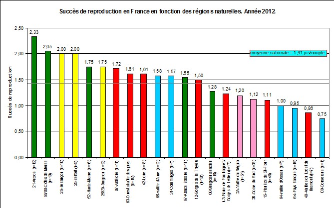Au final, 364 cas de nidification auront été suivis en 2012. Ces 364 couples ont produits 515 jeunes à l’envol soit un taux moyen de 1,41 jeune/cple, c’est-à-dire une reproduction dans la moyenne de ces dernières années.