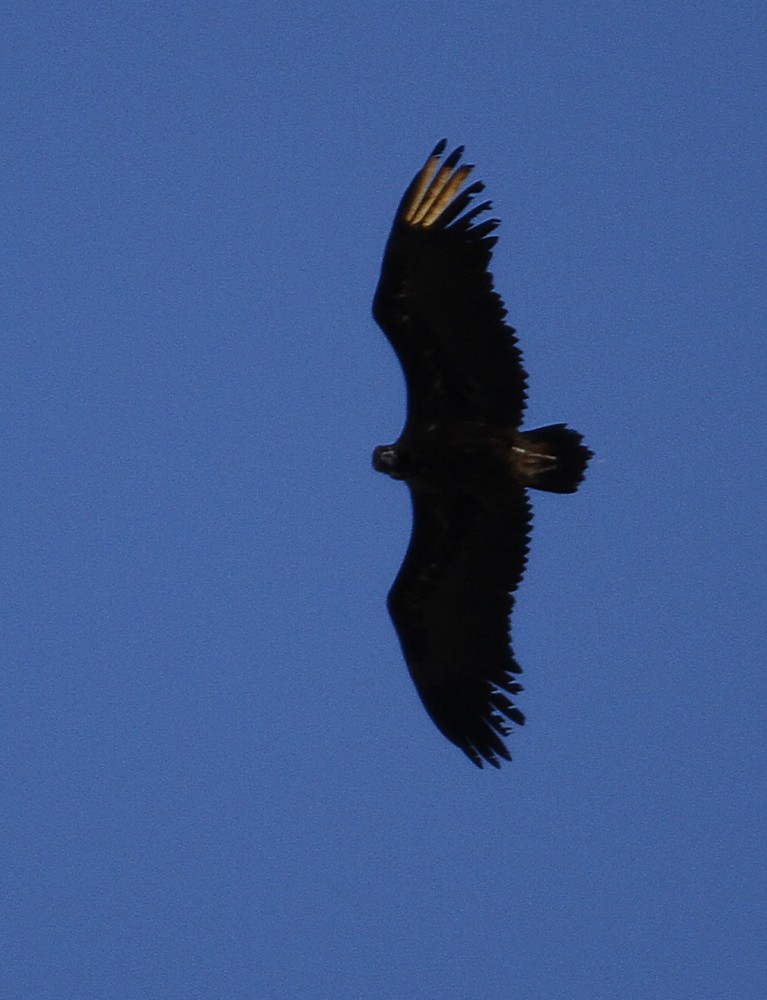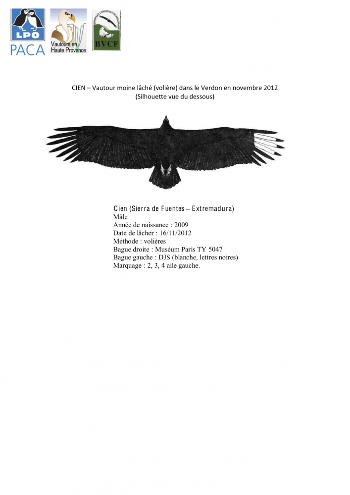 Cien, un Vautour moine lâché dans le Verdon en novembre 2012 (originaire de Sierra de Fuentas, Estrémadure) a été observé à plusieurs reprises sur le charnier de Cassagnes (48), dans les Grands Causses.