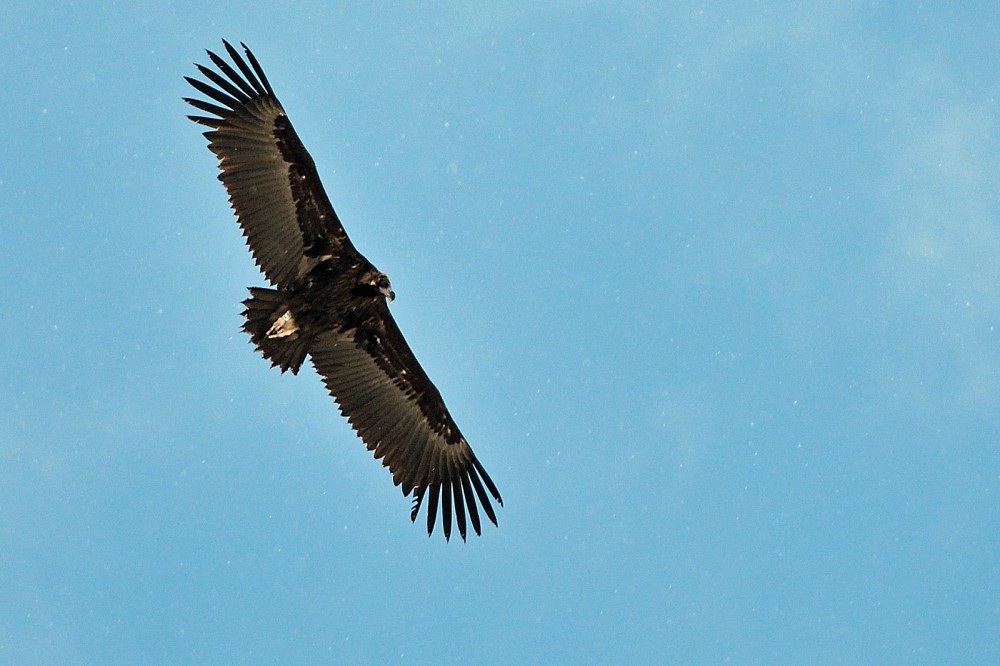 « Vers 15 heures, arrivée par l’Est d’un vautour au profil inhabituel pour moi. Sur quelques larges cercles, je repère sa couleur très sombre à distance et sa voilure paraissant plus trapue que sur le fauve : un Vautour moine, ma première observation en plus de dix ans de nourrissage sur ce site ! L’oiseau passe au dessus de l’aire de nourrissage à altitude moyenne, nous survole et après deux larges cercles, part en direction du sud vers la haute vallée de l’Aston (en direction de la frontière andorrane). Une bague peu visible sur sa patte droite, en regardant les photos on peut y lire FEX ».