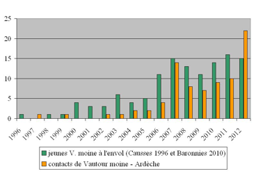 Le Vautour moine a été observé pour la première fois en Ardèche en 1997, au Mont Gerbier de Jonc (Rolande Fayolle, Alain Lesauvage). Cette observation suit d’un an la première naissance en nature dans les Grands Causses (voir graphique ci-dessous).