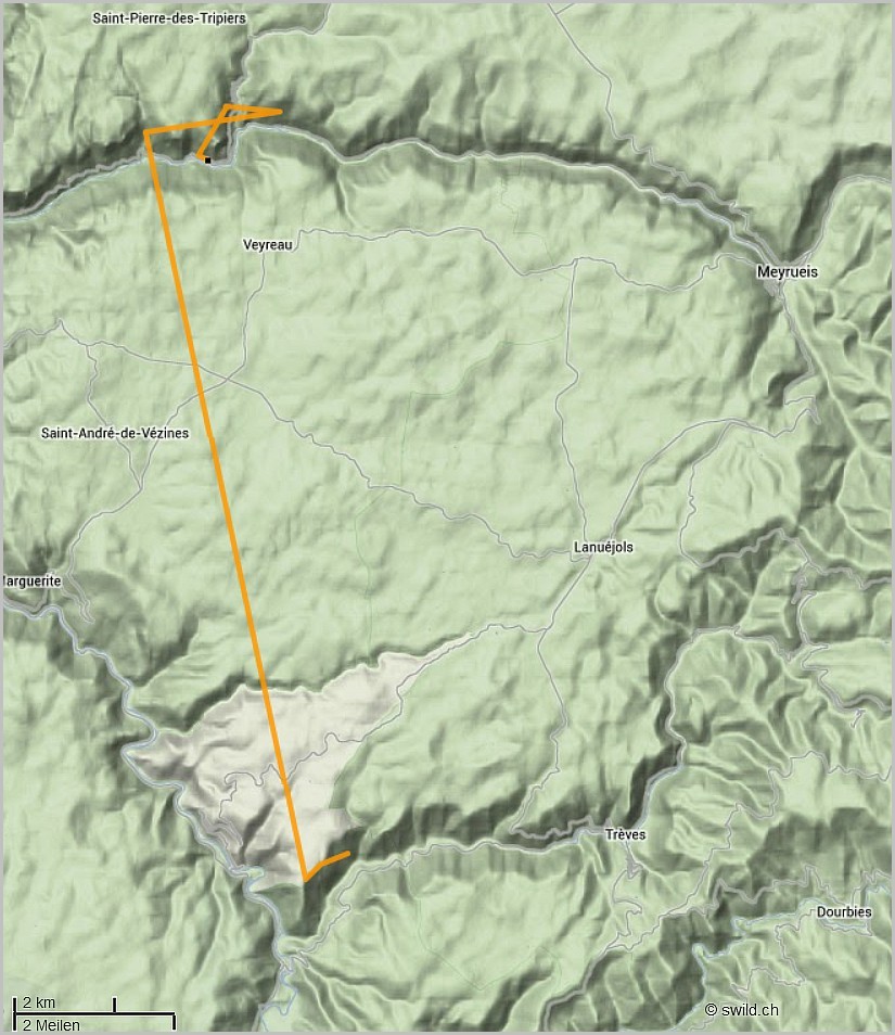 Jeudi 25 juillet, le jeune Gypaète a traversé la Causse Noir pour gagner les gorges de la Jonte. Son cadavre a été retrouvé samedi 27 juillet, à l’exact aplomb d’une ligne élecrique à moyenne tension (commune de Saint-Pierre des Tripiers, 48). La collision avec les cables, en bas de vallée, semble être à l’origine de sa mort.
