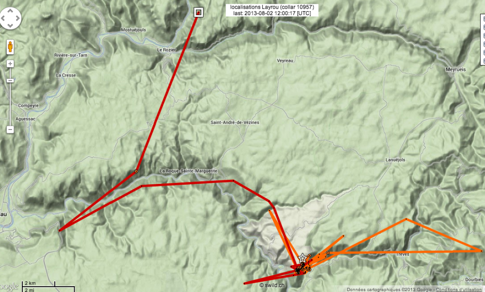 Malgré sa solitude et des conditions de vol difficiles (fortes rafales de vent depuis une semaine), l’apprentissage de LAYROU se poursuit normalement. Il a effectué de longs vols hors du secteur de lâcher à partir du mardi 30 juillet 2013.