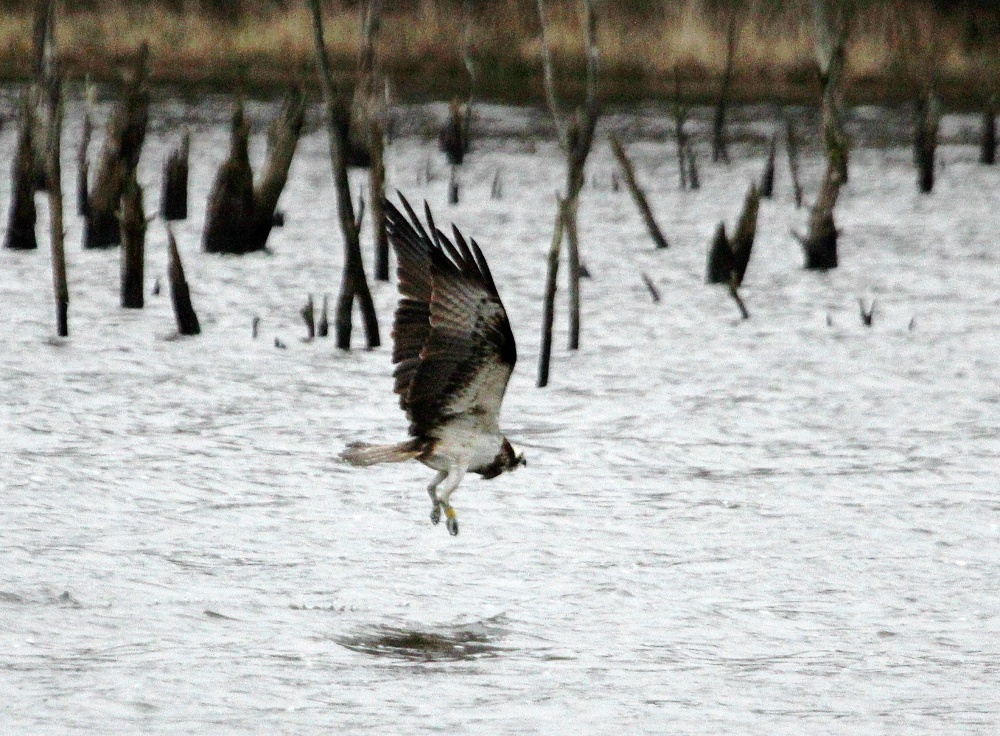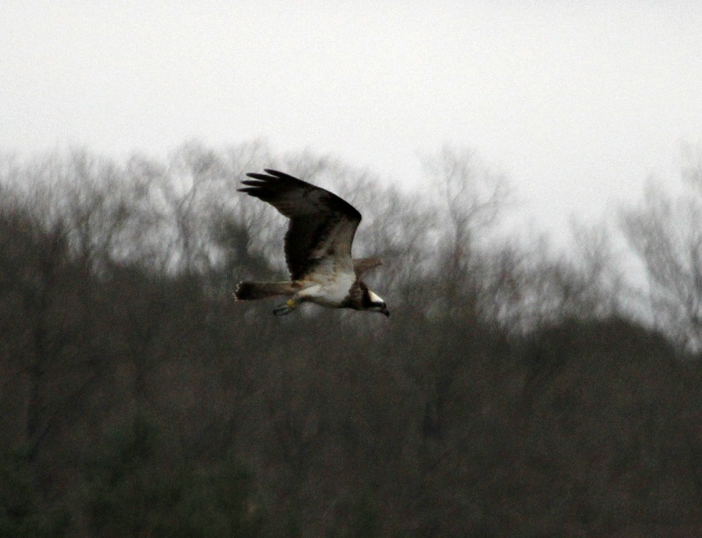 Dès le 14 février, deux observatrices assidues à l’observatoire du Ravoir ont vu un balbuzard survoler l’étang, puis un autre ou le même stationner le lendemain dans un vieux chêne. Le 17 février, des observateurs ont également rapporté avoir vu un balbuzard disparaitre dans les arbres environnant l’étang. Des séances quotidiennes d’observation depuis cette date ont permis à G.Perrodin de contacter un oiseau le 20 février et de le photographier. Cet individu, probablement une femelle, porte une bague jaune sur le tarse droit. Rien ne permet évidemment pour le moment d’en être certain, mais compte tenu de ces observations, il se pourrait que ce soit »Panchita » qui soit déjà revenue du nord de l’Espagne où elle passe l’hiver et où elle a été baguée encore en plumage juvénile en février 2011. L’an dernier, elle avait été vue pour la dernière fois près de son nid à la mi-août, bien avant l’émancipation de ses deux premiers jeunes..