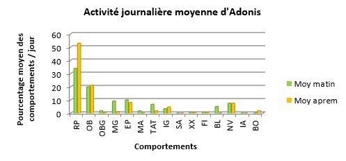 Ces analyses, permettent de constater des différences (temps moyen des types d’activités) ainsi que des similitudes (tendance des comportements) entre Adonis et Jacinthe, sur un certain nombre de points comportementaux.