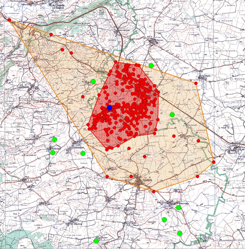 migration pré-nuptiale 2011 (réalisation : Romain Riols)La carte suivante présente le domaine vital de Romulus en 2011. Ce dernier peut aujourd’hui être estimé à 4,8 km² au sein d’une zone de 20 km² dans laquelle Romulus ferait quelques excursions de temps en temps ; Romulus semble éviter soigneusement les sites de reproduction des couples voisins (en vert sur la carte) ; 2 dortoirs existent, un à 340 m au SO du site de nid dans un autre bosquet de pins et un autre à 1200 m du nid en bordure d’Ussel dans une haie de frênes.