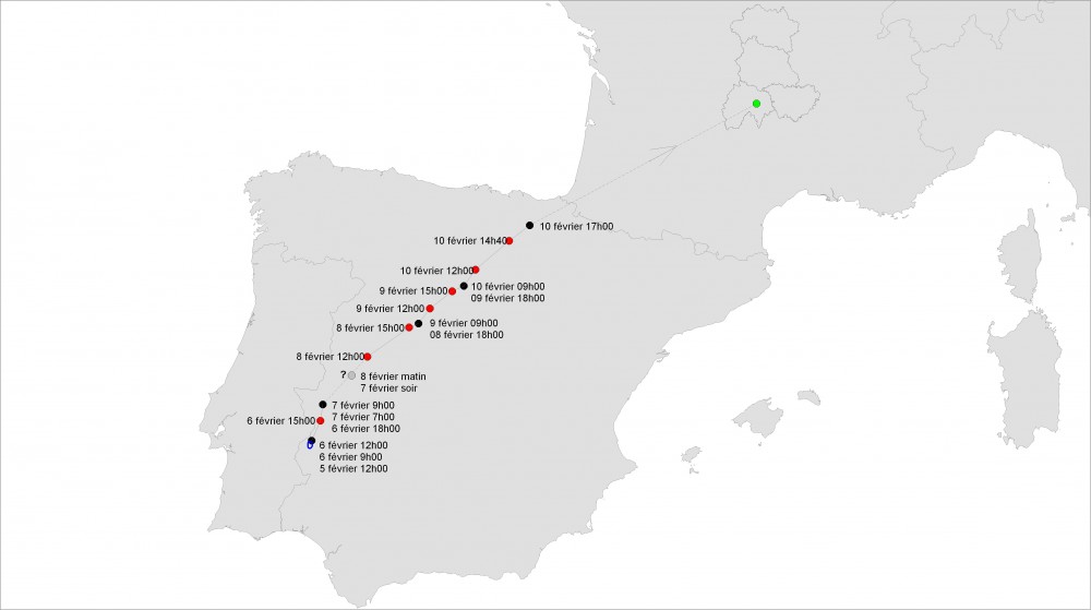 24 décembre 2010 (cadeau de Noël !) : quatre localisation Argos classiques mais fiables indiquent que « Romulus » se trouve en Extremadura près de la frontière portugaise. Pour un vieil adulte supposé plus ou moins sédentaire, surprise de taille !
